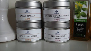 Natürlich kam dann das, was mir immer passiert bei sowas: Ich konnte mich gar nicht satt riechen und schon mal gar nicht entscheiden! Nach einer gefühlten Ewigkeit und dem von mir immer wieder stumm aufgesagten Mantra "Man kann ja auch noch online bestellen!" hat Tommy sich für zwei Sorten Chili entschieden (Rote Chili Chipotle Jalapeno - rauchig und gut scharf - und Chili Habanero - mega scharf!). Ich habe Garam Masala und Rotes Thai Curry genommen. Ich und Curry...ihr wisst ja ;).